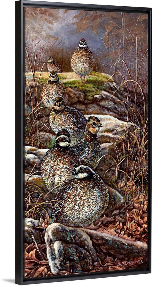 <p>Contemporary painting of quails sitting on rocks.</p>