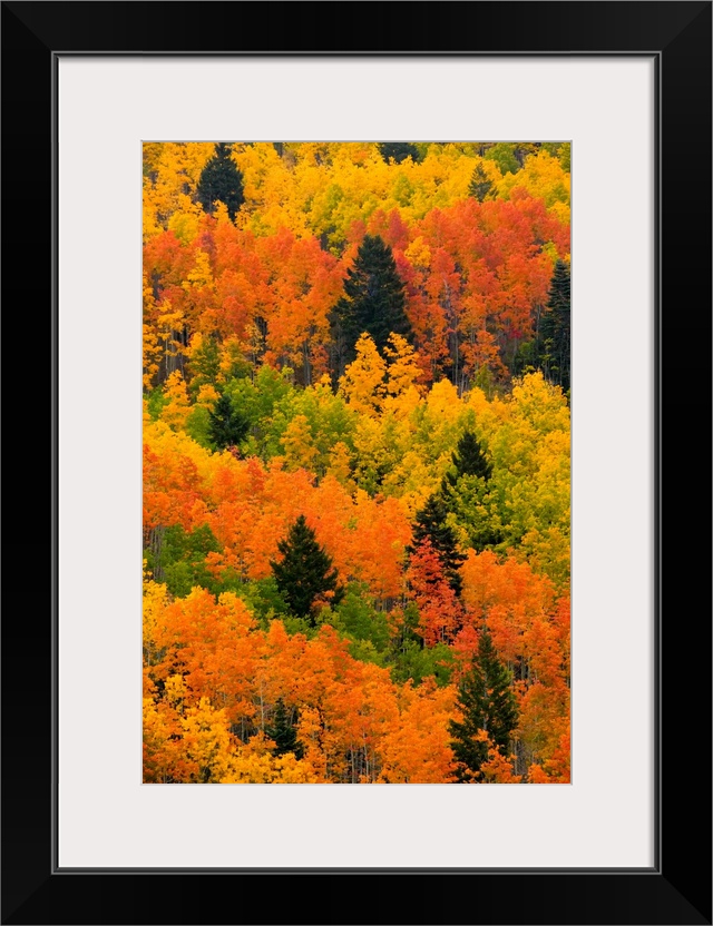 <p>Vertical photograph from the National Geographic Collection of a vibrant, dense forest of quaking Aspen trees (Populus tremuloides), in fall colors near Santa Fe, in the Santa Fe National Forest, New Mexico.</p>