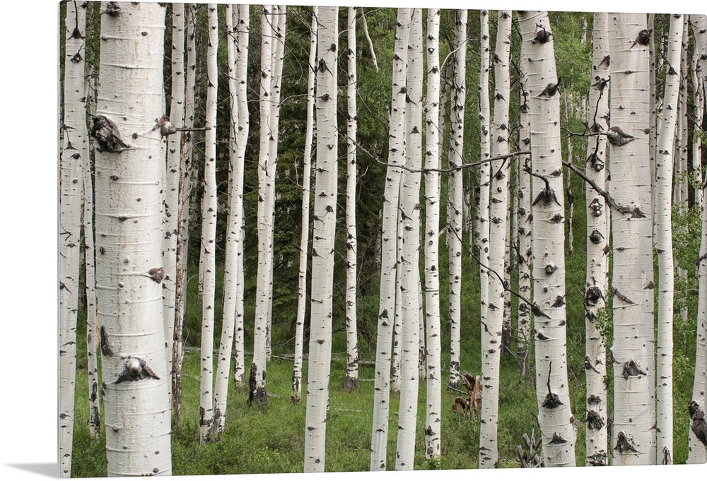 <p>Quaking aspen tree trunks (Populus tremuloides) in a woodland in Yellowstone National Park, Wyoming, United States of America</p>
