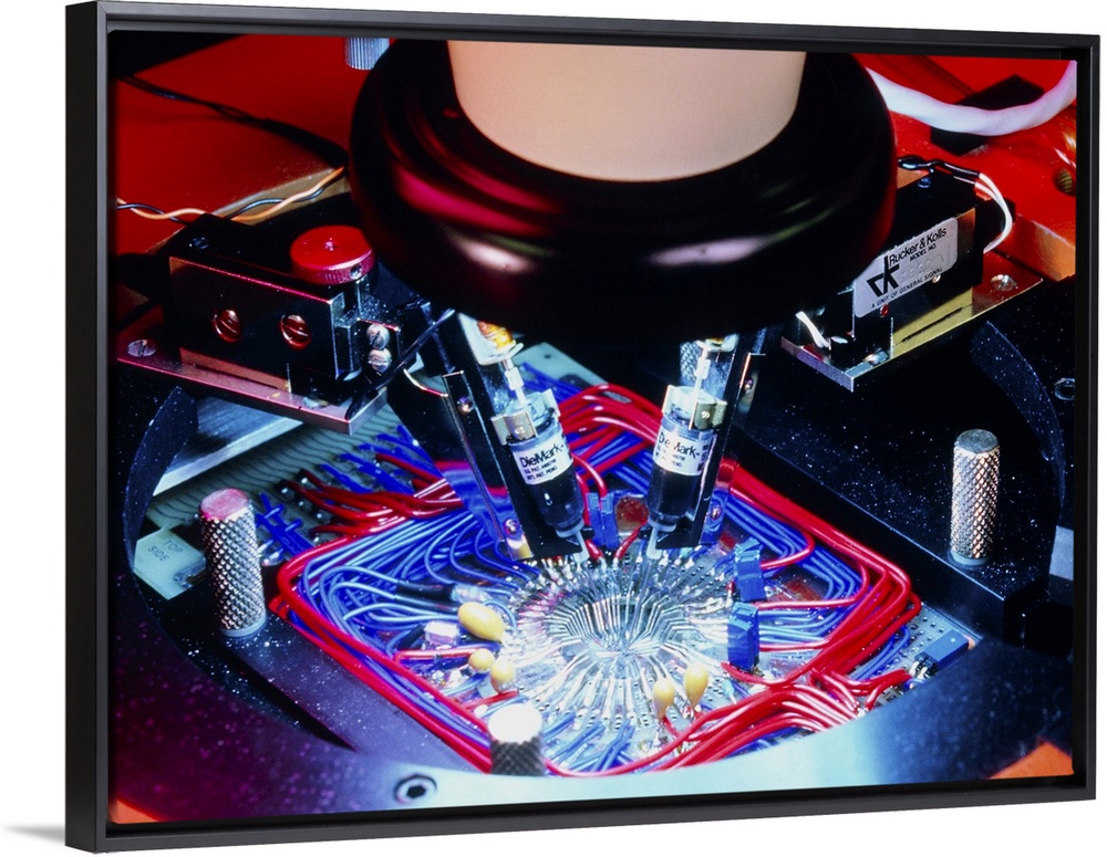<p>Quality control stage in the fabrication of silicon-based integrated circuit wafers, showing a close-up of a probe which automatically test the circuitry of each chip on the wafer. Any chips that are found to be faulty are marked with ink contained in the two pens visible in centre. After probing, a wafer is baked to harden the ink; defective chips may then be identified and discarded when the wafer is sawn into individual integrated circuits, ready for the attachment of connector wires and final packaging (encapsulation).</p>