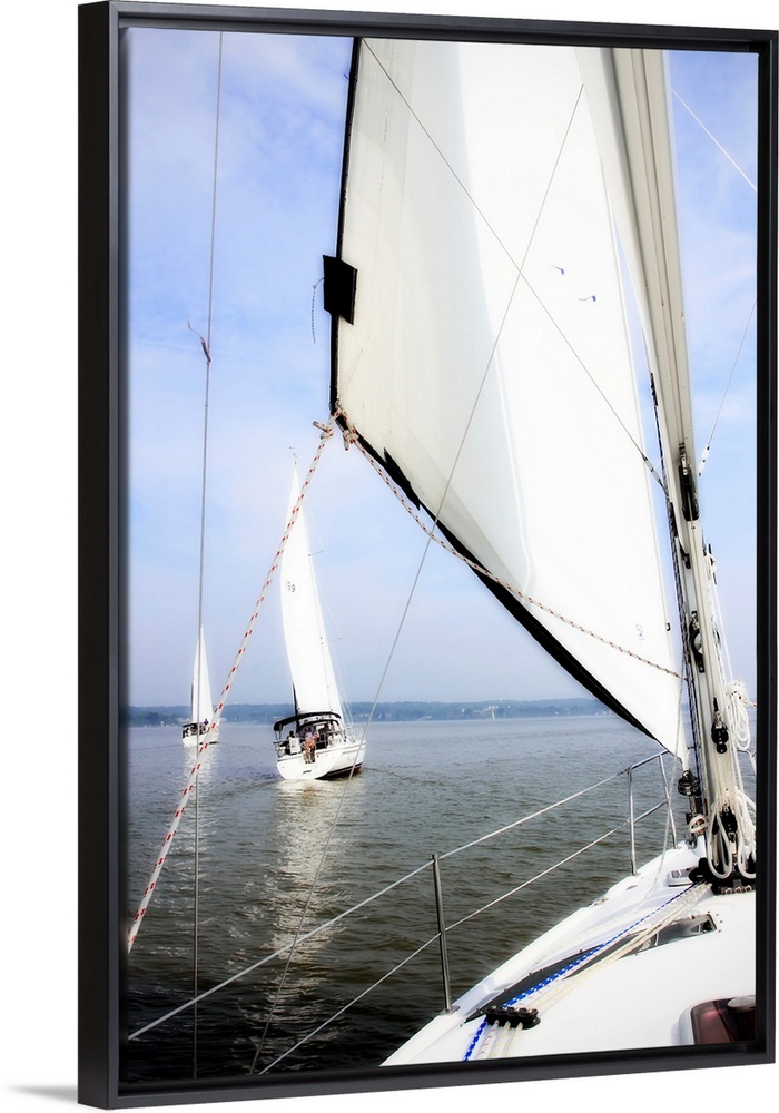<p>Big vertical photograph of a sail and the front of a sailboat, looking out toward the water where two other sailboats are ahead, beneath a partly cloudy blue sky.</p>