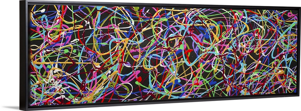 <p>A contemporary abstract painting of a very busy interlocking web of neon colors in thin string-like strokes.</p>
