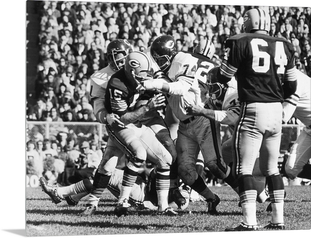 <p>Quarterback Bart Starr of the Green Bay Packers being sacked for an 11-yard loss by Dick Butkus and Bob Kilcullen (74) of the Chicago Bears, during a game at Lambeau Field, Green Bay, Wisconsin, 3 October 1965.</p>