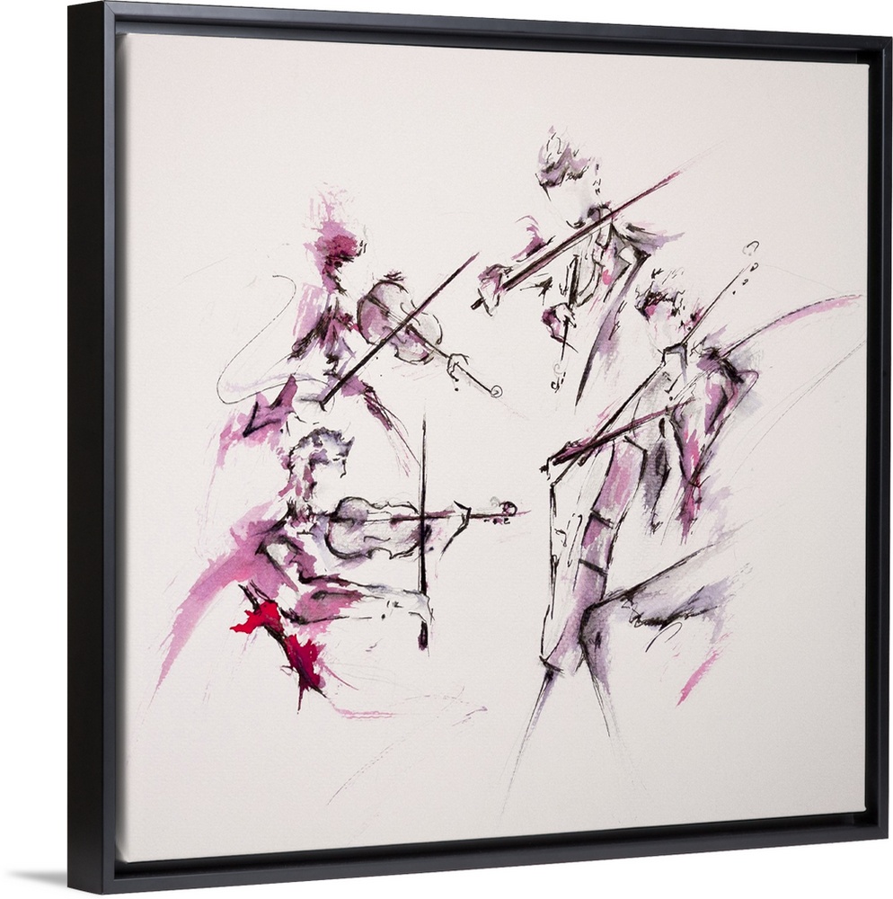 <p>Watercolor and ink painting of a string quartet playing the violins, viola, and cello.</p>