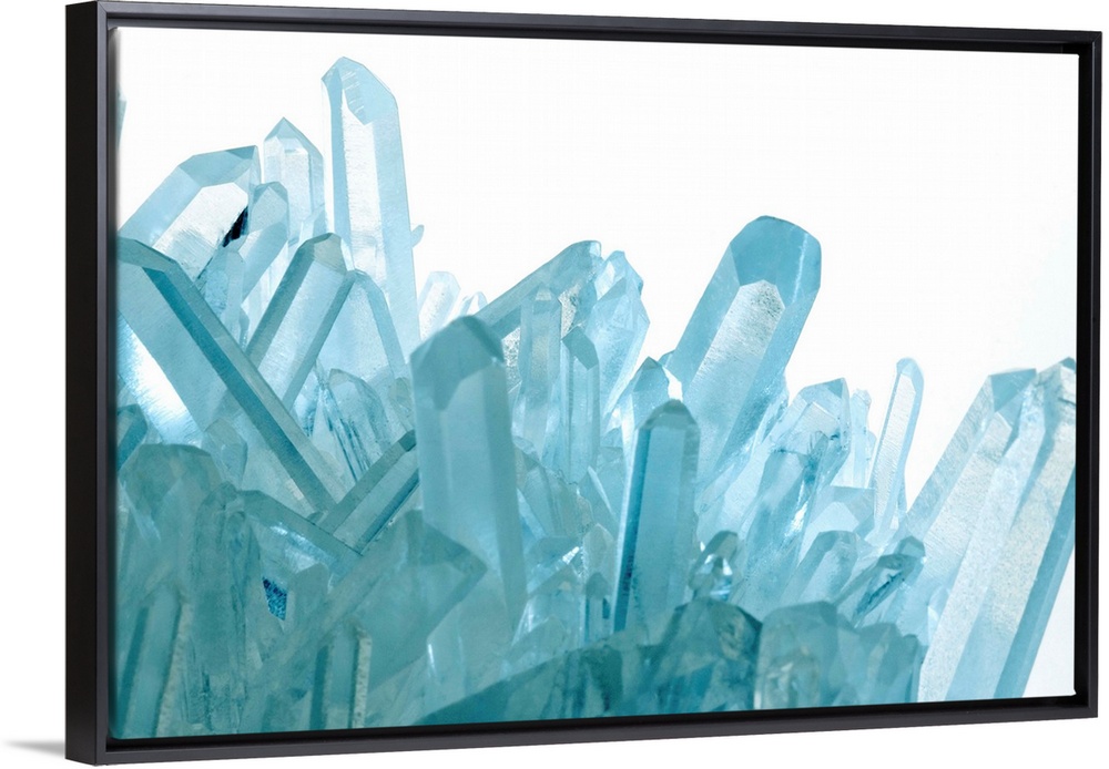<p>Quartz crystals, photographed under blue light. Chemically silicon dioxide, quartz is one of the most common rock-forming minerals. Its crystals are of the hexagonal system and commonly form a six-sided prism.</p>