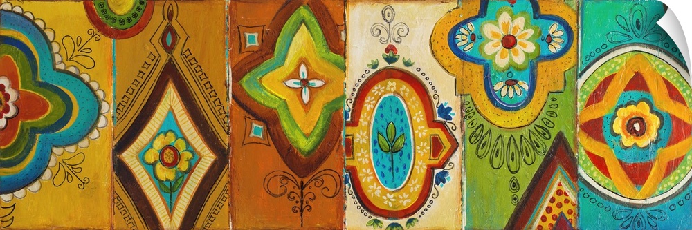 <p>Contemporary painting of a collection of folk art shapes on a multicolored background.</p>