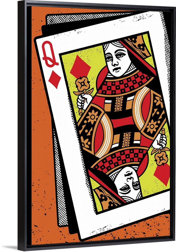<p>Digital illustration of a Queen of diamonds on an orange background.</p>