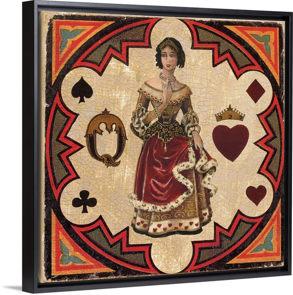 <p>Square vintage illustration of a Queen inside a circular design with a heart, spade, clover, and diamond surrounding him.</p>