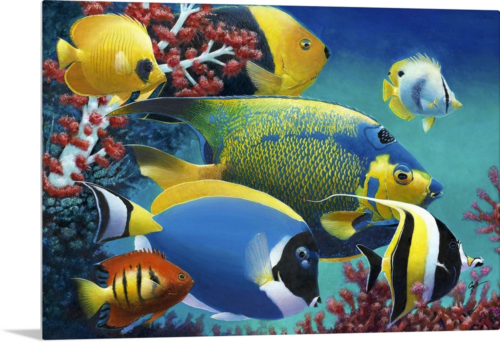 <p>Contemporary painting of tropical fish swimming together.</p>