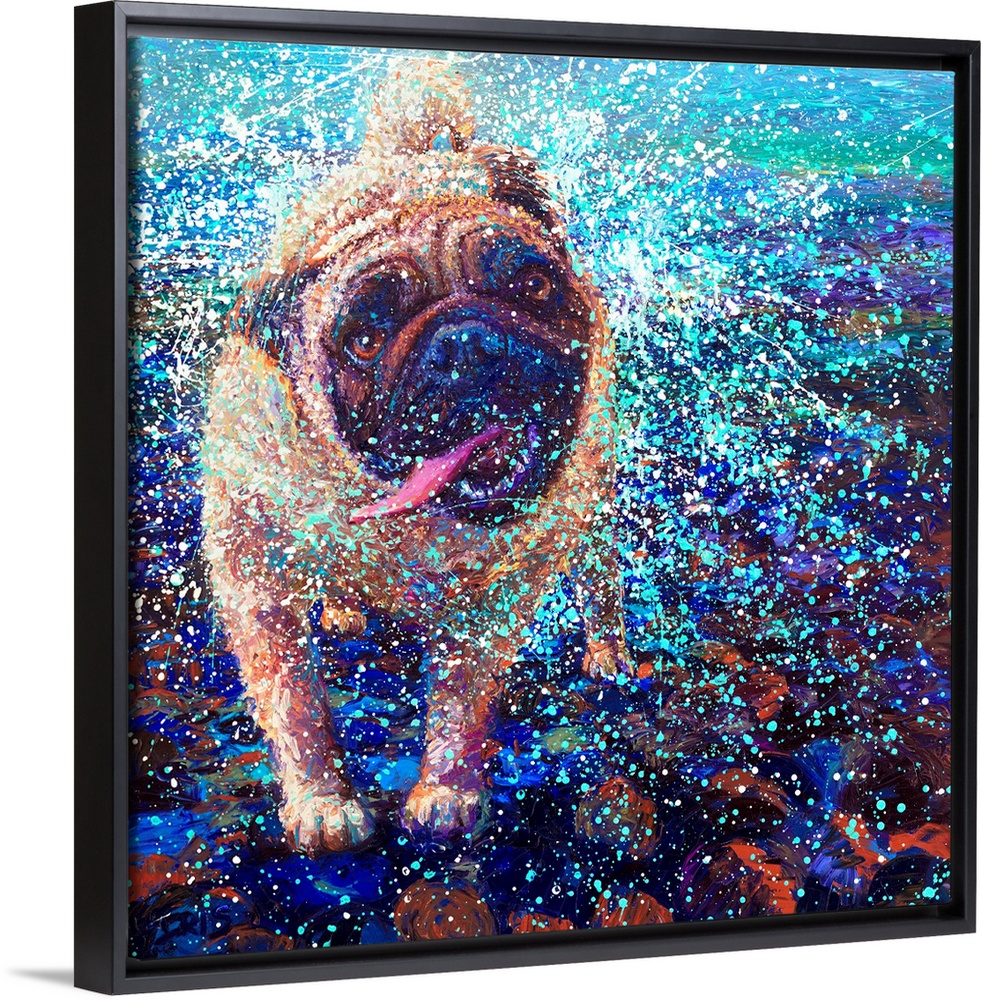 <p>Brightly colored contemporary artwork of a pug shaking off water.</p>
