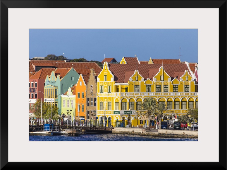 <p>Curacao, Willemstad, Queen Emma pontoon bridge and colonial merchant houses lining Handelskade along Punda's waterfront.</p>
