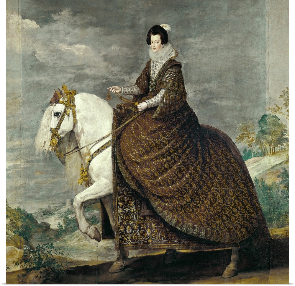 <p>VELAZQUEZ, Diego Rodriguez de Silva (1599-1660). Queen Isabel de Bourbon, wife of Felipe IV, on Horseback. 1635. Baroque art. Oil on canvas. SPAIN. Madrid. Prado Museum. -</p>
