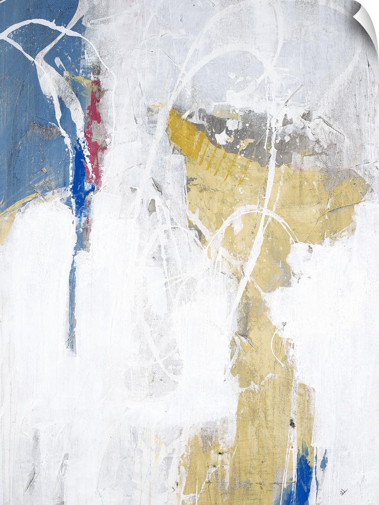 <p>Contemporary abstract painting with pastel pink, yellow, and blue with white splatter and lines taking over the top.</p>