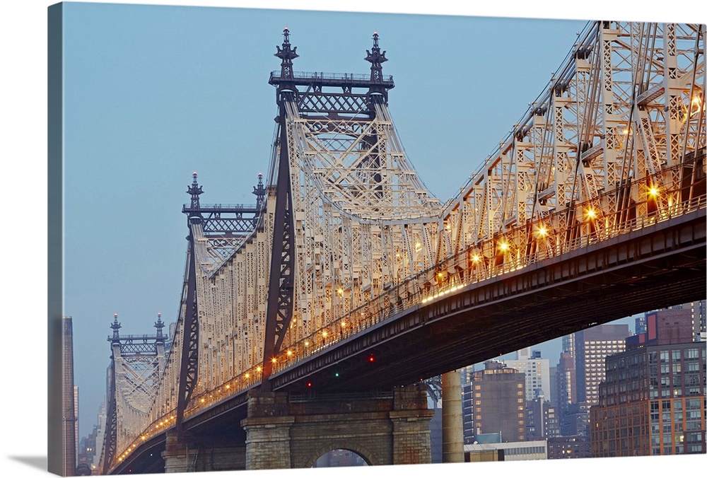 <p>Queensboro Bridge illuminated at sunrise. This double-decked Cantilever bridge was opened in 1909 and connects Long Island City and Manhattan</p>