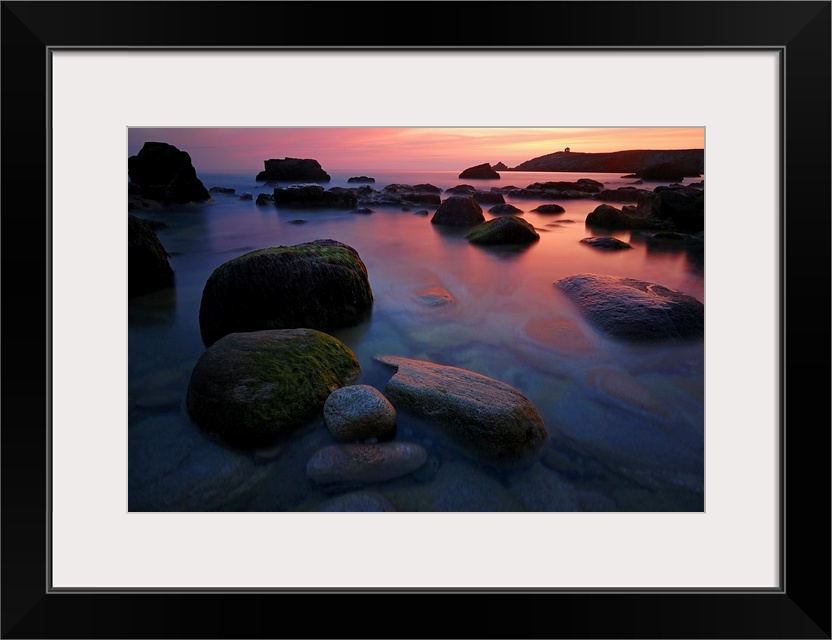 <p>Rocky beach during pink sunset in Brittany, France, big rocks and quite sea at first plan.</p>