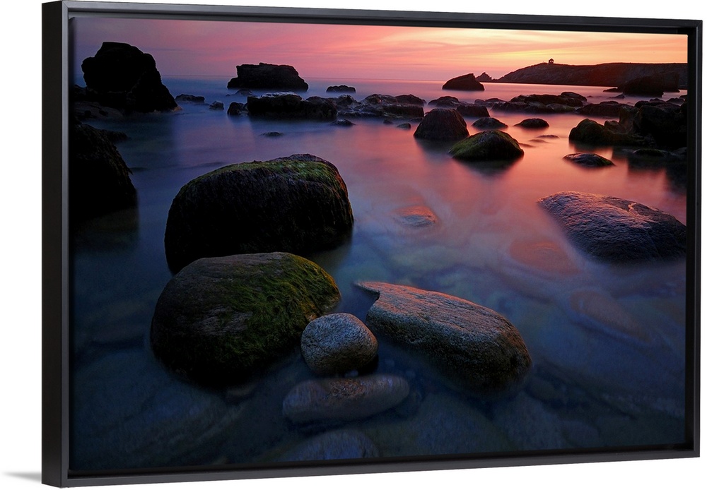 <p>Rocky beach during pink sunset in Brittany, France, big rocks and quite sea at first plan.</p>