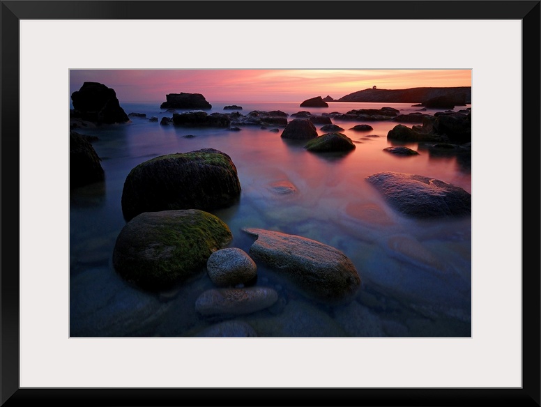 <p>Rocky beach during pink sunset in Brittany, France, big rocks and quite sea at first plan.</p>
