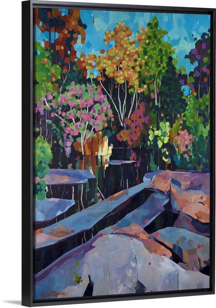 <p>Painting of many colored trees with still water, reflections and rocks.</p>