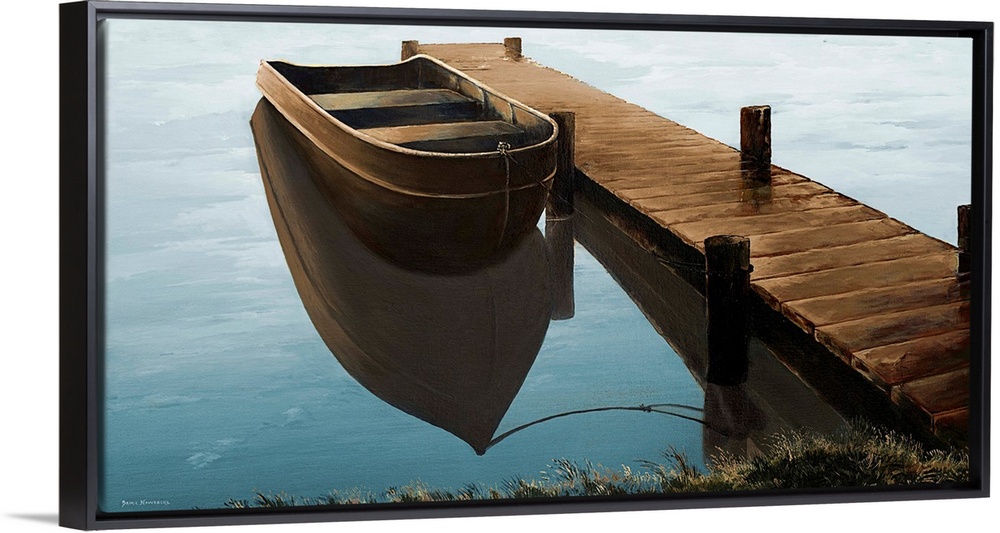 <p>Contemporary artwork of a small boat tied to a pier in a lake.</p>