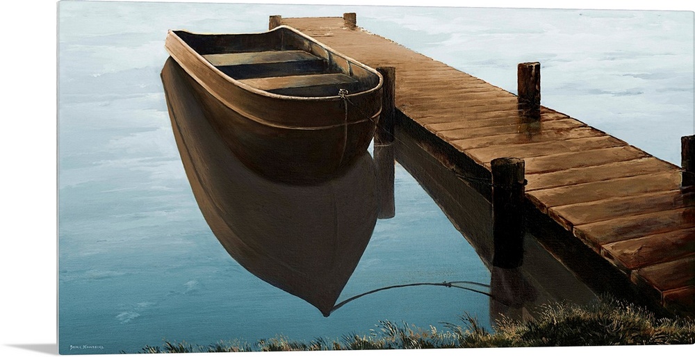 <p>Contemporary artwork of a small boat tied to a pier in a lake.</p>