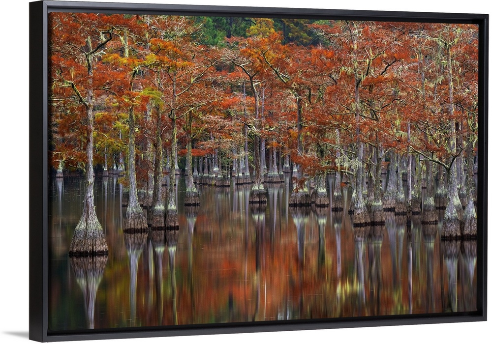 <p>Beautiful fall color on old cypress trees reflected on the calm water of this small cove.</p>