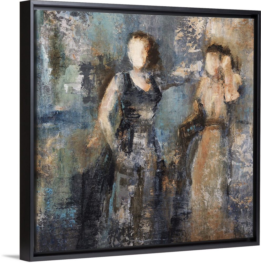 <p>Contemporary abstract painting using cool tones and weathered textures to create female figures.</p>