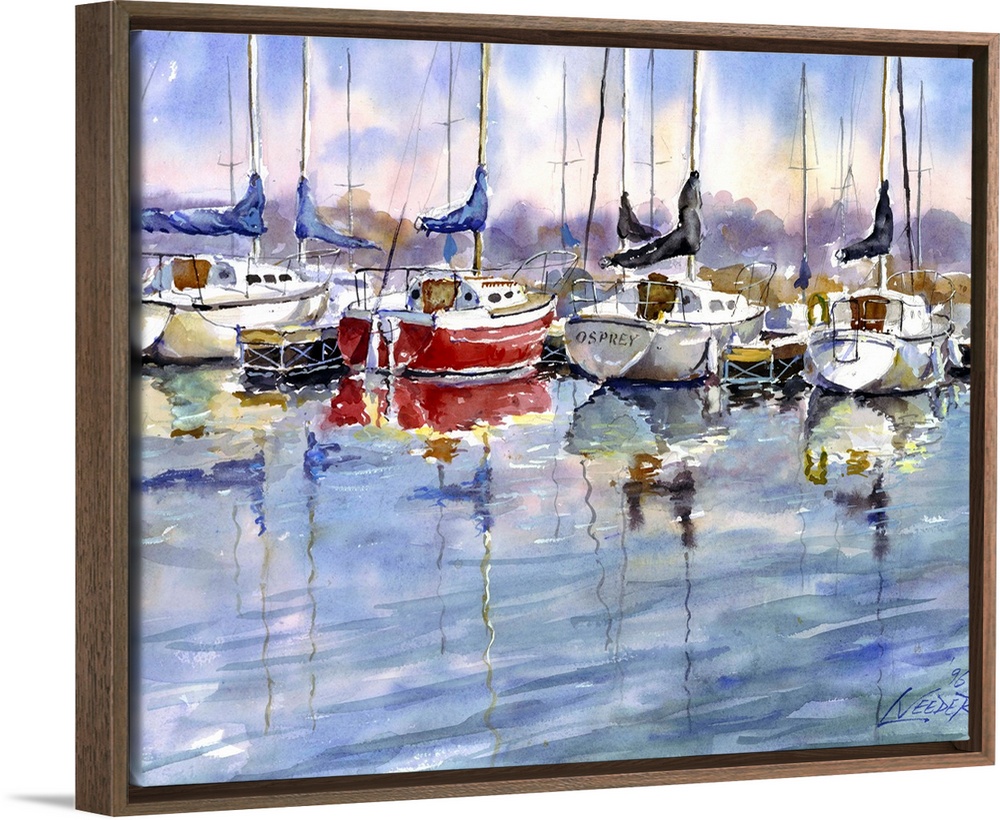 <p>Contemporary piece using water colors to paint sail boats that sit docked at the marina.</p>