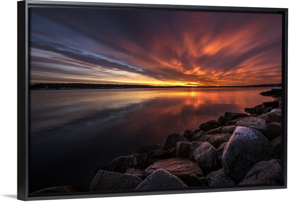 <p>Beautiful sunset colors and dramatic clouds over a rocky beach.</p>