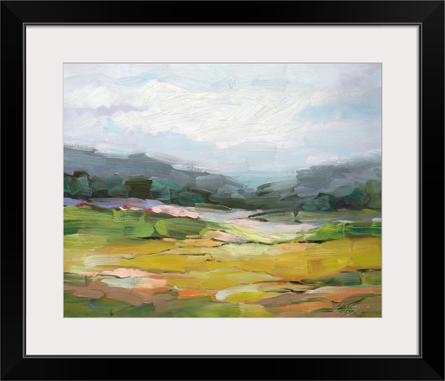 <p>A beautiful calm landscape painting in a contemporary style, with thick brushstrokes of color. A warm green meadow sits in front on grey mountains under a blue and white sky</p>