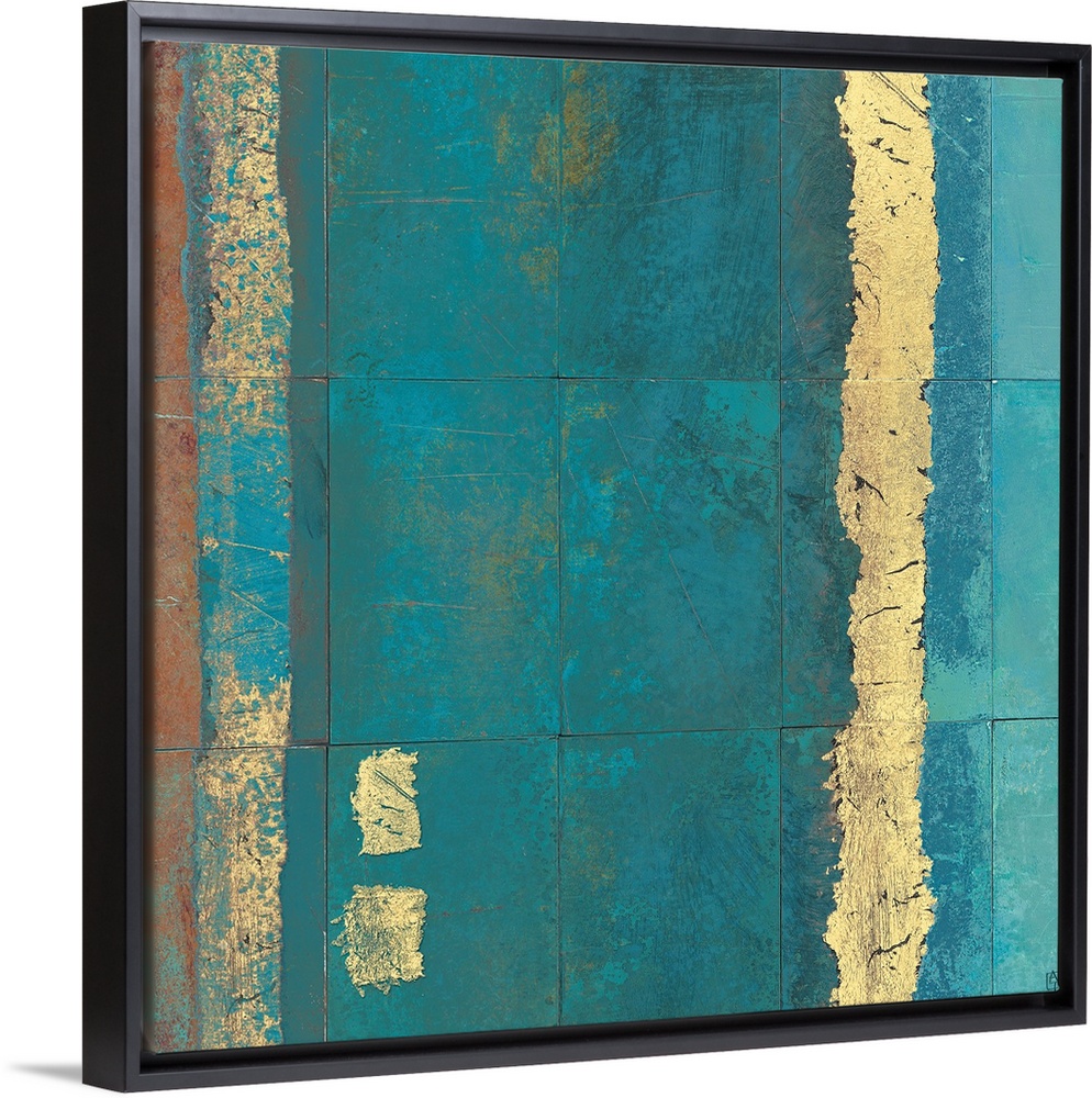 <p>Square abstract painting done in turquoise tones resembling tiles, divided by strokes of neutral colors.</p>