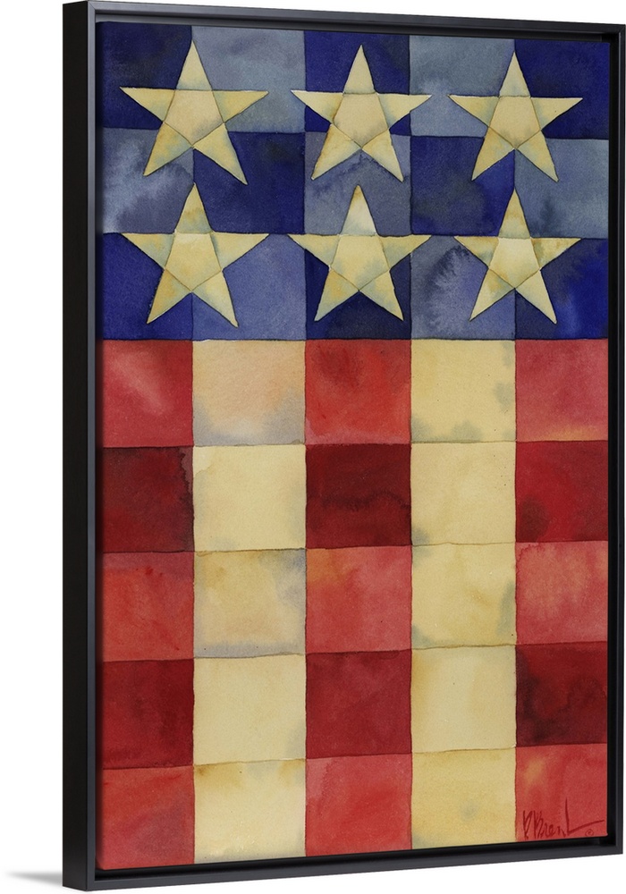 <p>Painting of a simplified American flag done in a style reminiscent of traditional piece quilting.</p>