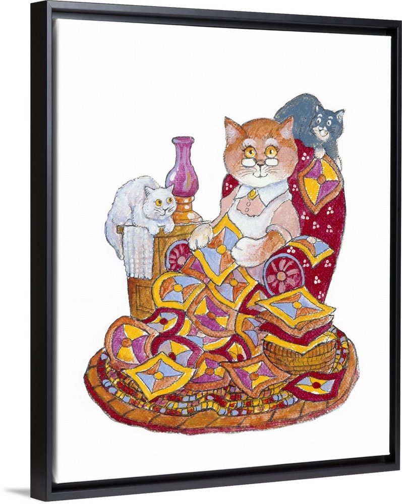 <p>Cat in spectacles sits in arm chair quilting, surrounded by two pet cats.</p>