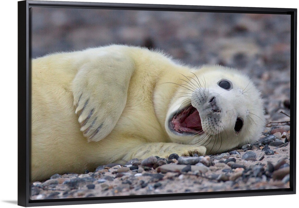 <p>Cute baby seal with white fur lounging on the beach.</p>