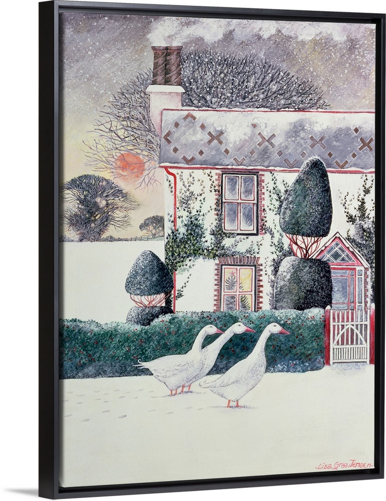 <p>Contemporary painting of three geese in the snow outside a house.</p>
