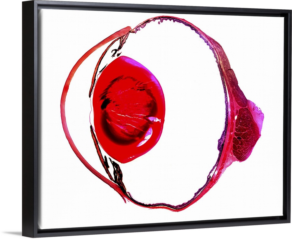 <p>Rabbit eye. Light micrograph of a longitudinal section through the eye of a rabbit (Oryctolagus cuniculus). The rabbit has a typical mammalian eye structure, with a hemispherical rear chamber (centre), a biconvex lens (red) and a cornea (far left) with pronounced curvature. The rabbit is mainly nocturnal, so it has a shorter rear chamber to accommodate the shorter focal length of the lens. The rabbit also lives a life dominated by activity on the horizon to detect predators, so the eye has a narrow strip on the retina (visual streak) where the ganglion (nerve) cell density is high. The retina is inside the eye, on the rear surface (right). Magnification: x14 when printed at 10 centimetres across.</p>