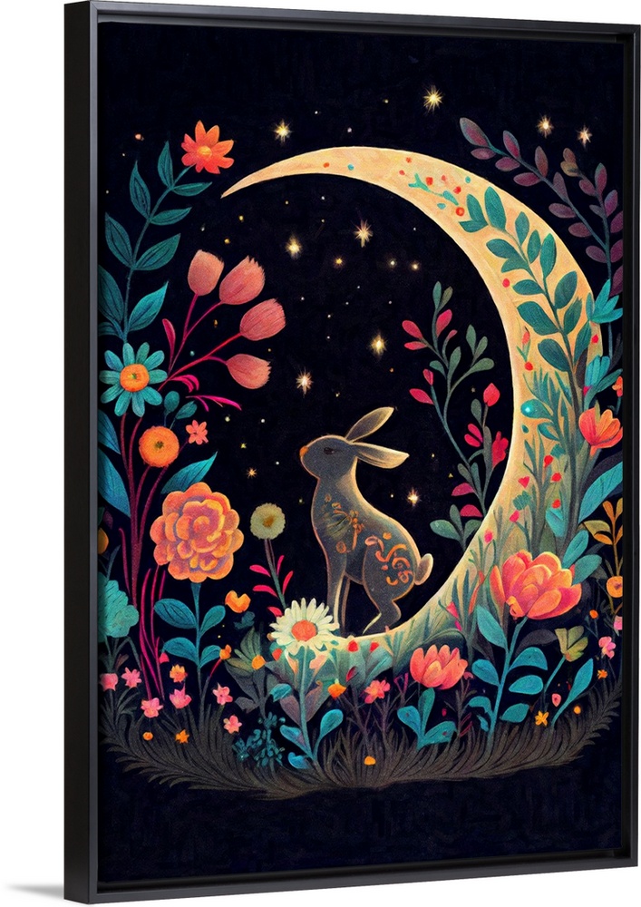 <p>This image by JK Stewart for Duirwaigh Studios is of a rabbit on a crescent moon with florals at night.</p>