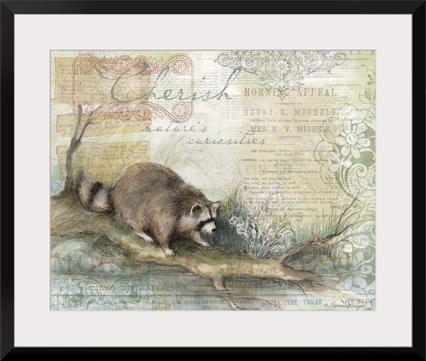 <p>The curious raccoon on a logperfect for den, lodge, cabin, or office.</p>