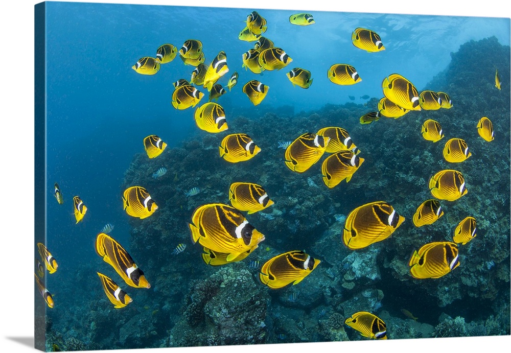 <p>Raccoon butterflyfish (chaetodon lunula) can sometimes be found in large schools over the reef. Hawaii, united states of America.</p>
