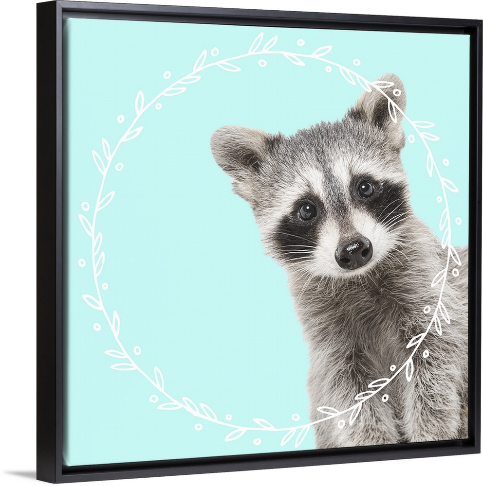 <p>Black and white photograph of a baby raccoon on the middle of a light blue background with an illustrated white, leafy wreath.</p>