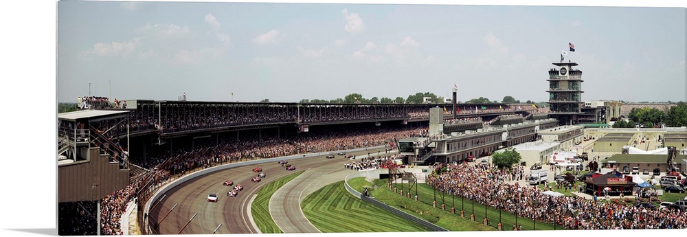 <p>Race cars in pace lap in a stadium, Indianapolis 500, Indianapolis Motor Speedway, Speedway, Indianapolis, Indiana, USA</p>