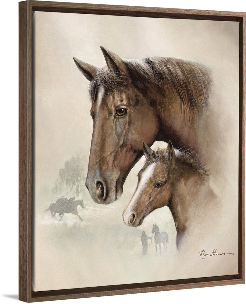 <p>Painted portrait of a brown mare and her young foal.</p>