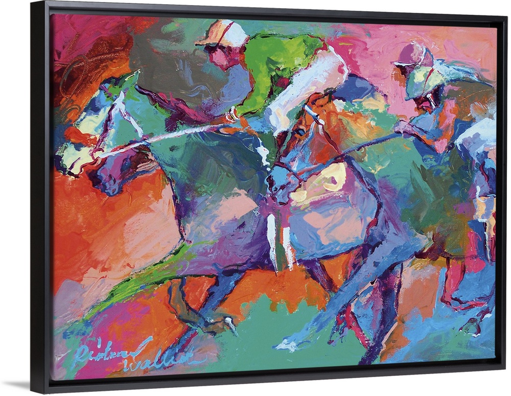 <p>Contemporary vibrant colorful painting of a jockey on horseback.</p>
