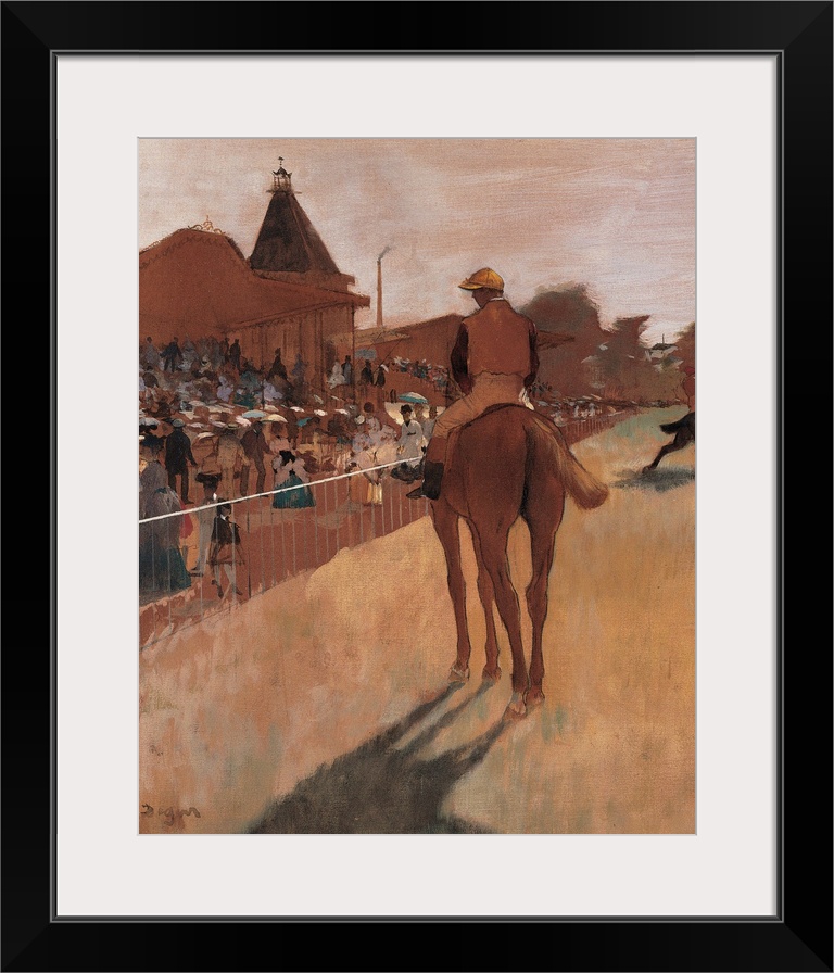 <p>Racehorses in Front of the Tribunes, by Edgar Degas, 1866 - 1868 about, 19th Century, oil on canvas, cm 46 x 61 - France, Ile de France, Paris, Muse dOrsay. Detail. Racehorses in front of tribunes brown jockey shadow. (237420) Everett Collection\Mondadori</p>