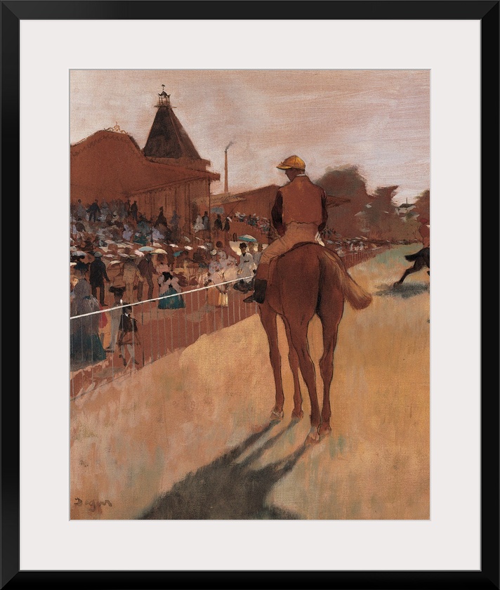 <p>Racehorses in Front of the Tribunes, by Edgar Degas, 1866 - 1868 about, 19th Century, oil on canvas, cm 46 x 61 - France, Ile de France, Paris, Muse dOrsay. Detail. Racehorses in front of tribunes brown jockey shadow. (237420) Everett Collection\Mondadori</p>