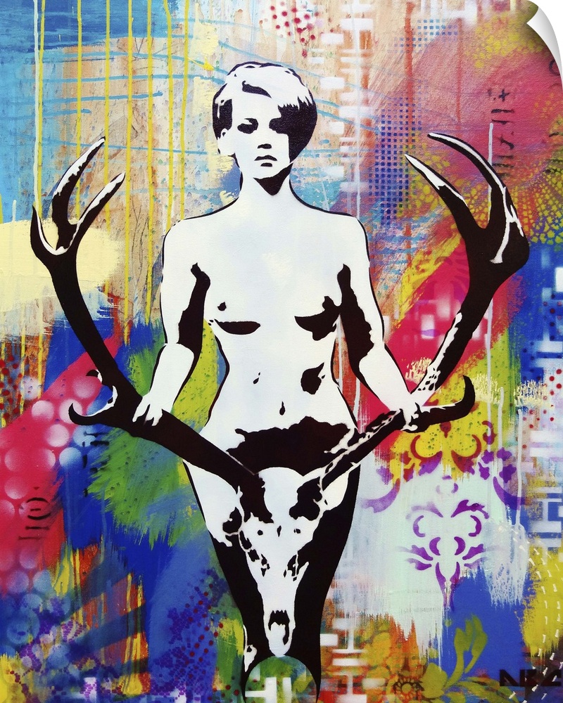 <p>Urban painting of a nude woman holding a large pair of antlers.</p>