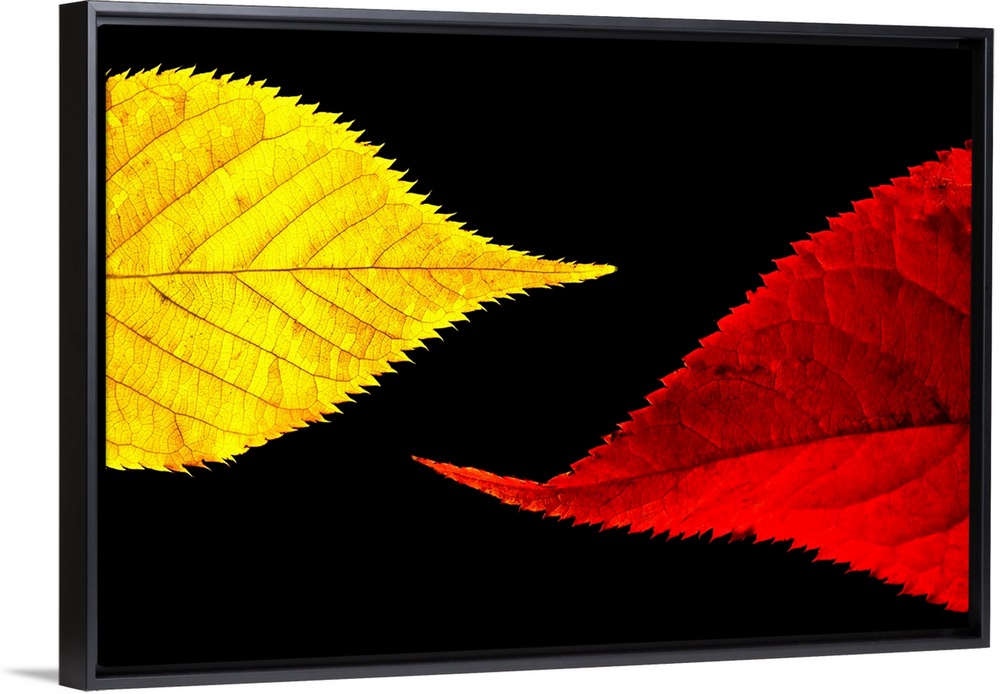 <p>Up-close photograph of two leaves contrasting in color.</p>