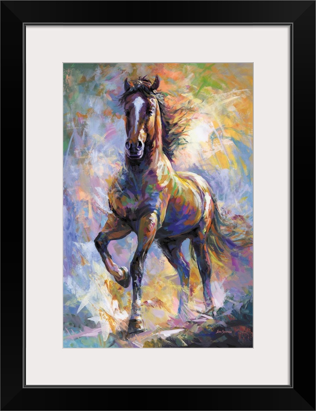 <p>A majestic horse steps forward through a whirlwind of color, its long hair flowing with motion and grace. Bold strokes in an expressive style sweep across the scene in violet, orange, and gold, creating rhythm and intensity. This contemporary artwork blends elegance, energy, and bold color in a striking display.</p>