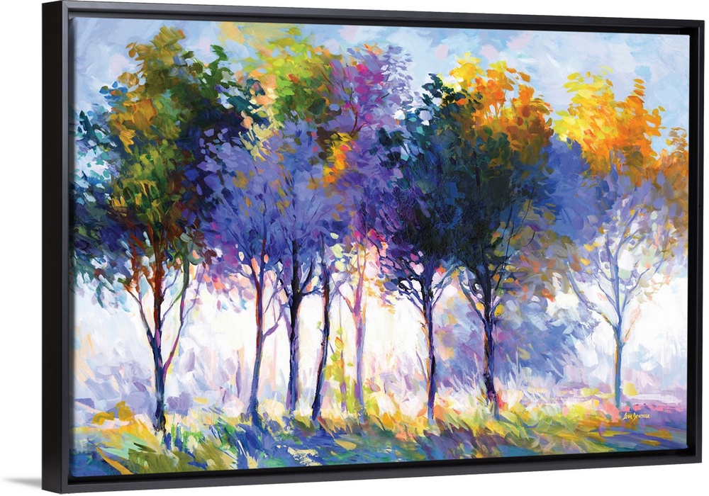 <p>A vibrant artwork of trees bathed in the soft, glowing light of the morning, with colorful leaves and a peaceful atmosphere.</p>