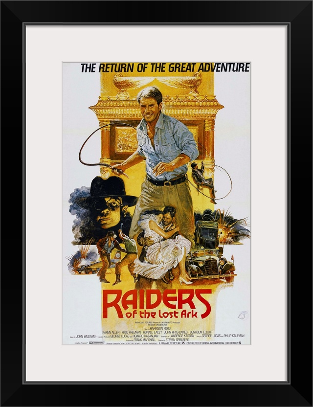 <p>RAIDERS OF THE LOST ARK, British poster art, Harrison Ford, (center), 1981.</p>