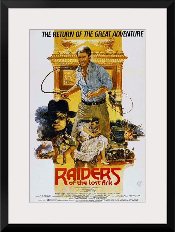 <p>RAIDERS OF THE LOST ARK, British poster art, Harrison Ford, (center), 1981.</p>